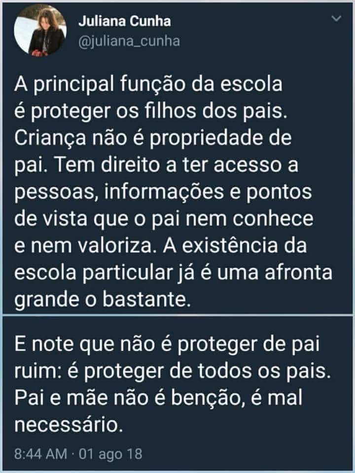 Numa rolagem despretensiosa pelo meu Facebook, deparei-me com uma imagem que resgatava um antigo post da jornalista e professora Juliana Cunha. As frases, afiadas como navalha, me chamaram atenção pela ousadia: “a principal função da escola é proteger os filhos dos pais”; “pai e mãe não é bênção, é mal necessário”. Palavras que, lidas sem respiro, soam como um manifesto contra a instituição familiar.